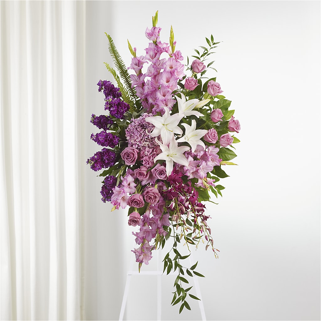 Partagez vos condoléances et votre soutien avec cette véritable présentation de roses lavande, de glaïeuls et de lys, adaptée à un service funéraire.